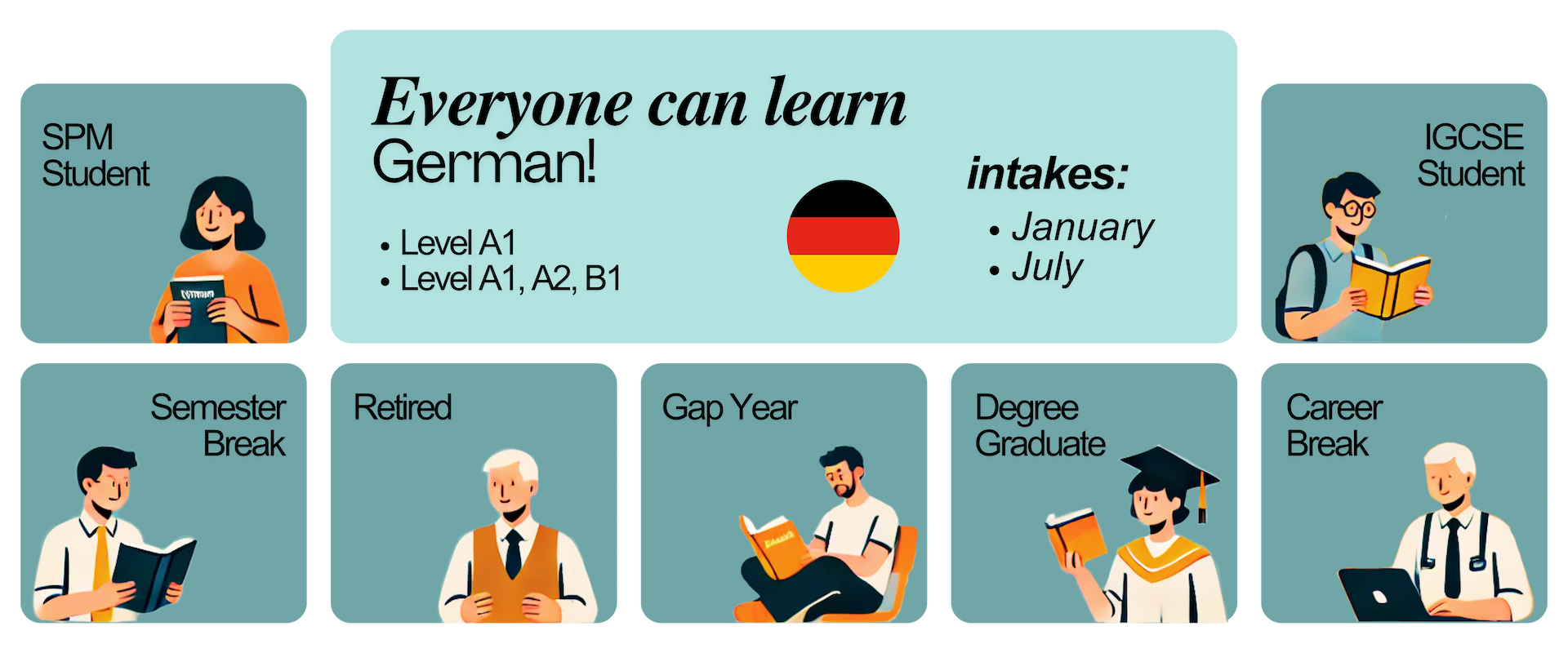 German Language Level A1 The course is designed to facilitate achievement of the following outcomes in all 4 aspects (Speaking, Reading, Writing, Listening) (1) Ability to interact in a simple way and introduce themselves, as well as answer basic questions about personal information and understand gestures. (2) Ability to use known, mundane and commonly used phrases and simple sentences (e.g., information about themselves and their family, about shopping, work/school, their living situation) (3) Ability to understand short, basic conversations in everyday situations if the interlocutor/s speaks slowly and clearly. |